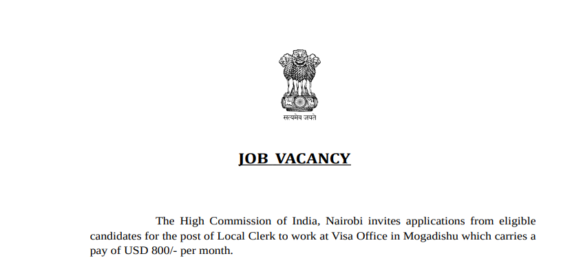 The High Commission of India, Nairobi invites applications from eligible candidates for the post of Local Clerk to work at Visa Office in Mogadishu which carries a pay of USD 800/- per month.