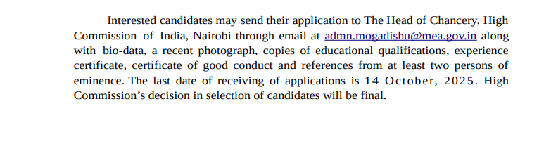 Interested candidates may send their application to The Head of Chancery, High Commission of India, Nairobi through email at [email protected] along with bio-data, a recent photograph, copies of educational qualifications, experience certificate, certificate of good conduct and references from at least two persons of eminence.