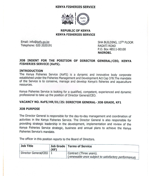 Kenya Fisheries Service website www.kefs.go.ke for a detailed Job indent and also to download
