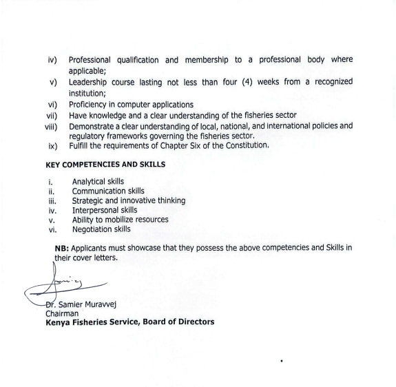 A duly filled Kenya Fisheries Service Application for Employment Form (version CEO:2022) (click the link to download) and a cover letter showcasing experience, key competencies and skills must be addressed to the Chairman of the Board of Directors, Kenya Fisheries Service, P.O. Box 48511-00100, Nairobi and