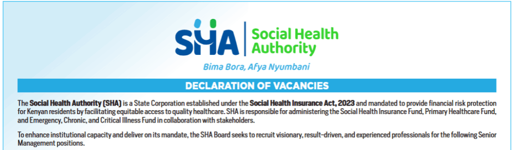 To enhance institutional capacity and deliver on its mandate, SHA Board seeks to recruit visionary, result-driven, and experienced professional for the following positions;