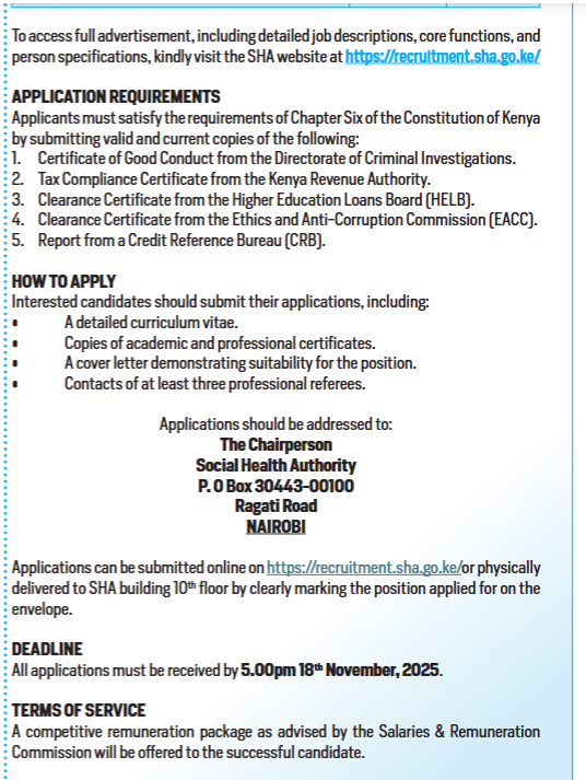 Applications can be submitted via either application portal https://recruitment.sha.go.ke/ or physically delivered to SHA building 10th floor by clearly marking the position applied for on the envelop.