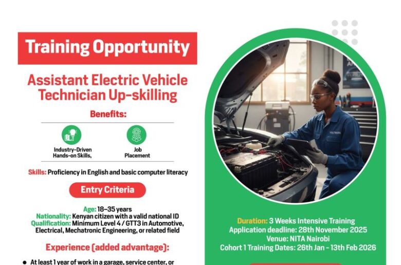 Applications for the Assistant Electric Vehicle Technician Upskiller Program are NOW OPEN NITA KENYA in partnership with WTS Foundation, and … Continue reading Applications for the Assistant Electric Vehicle Technician Upskiller Program are NOW OPEN