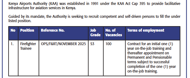 Kenya Airports Authority (KAA) continues to serve as a key institution in the aviation sector, providing and managing airport infrastructure across the country. Established under the KAA Act Cap 395, the Authority is mandated to construct, operate, and maintain aerodromes while ensuring that safety standards, passenger services, and aviation operations meet both national and international benchmarks. To sustain its high level of operational readiness, KAA has announced vacancies for the position of Firefighter Trainee under job grade S3, with 100 positions available.