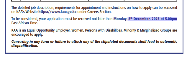 The selected candidates will join a structured one-year on-the-job training program. Upon successful completion, trainees may be considered for permanent and pensionable appointment, subject to performance evaluations, demonstrated competencies, and adherence to KAA’s safety and operational standards. The Authority encourages qualified individuals, including women, persons with disabilities, and members of marginalized groups, to apply.