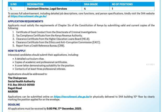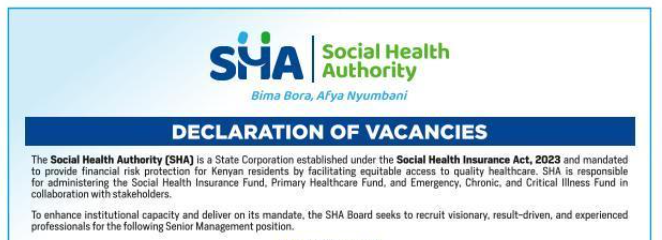 To enhance institutional capacity and deliver on its mandate, SHA Board seeks to recruit visionary, result-driven, and experienced professional for the following positions;