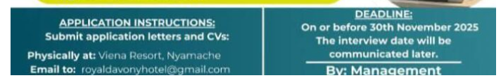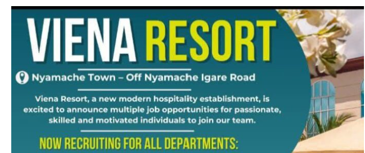 Viena Resort, located in Nyamache Town off Nyamache Igare Road, is a growing modern hospitality establishment offering high-quality service experiences to both leisure and business guests. As part of its continued expansion, the resort is inviting applications from motivated, service-oriented, and skilled individuals across all departments. This recruitment drive aims to strengthen the operational, administrative, and customer service functions of the resort while upholding high standards of professionalism, efficiency, and guest satisfaction.