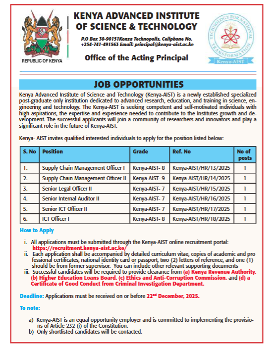 6 Vacancies Open At Kenya Advanced Institute of Science and Technology (Kenya-AIST)