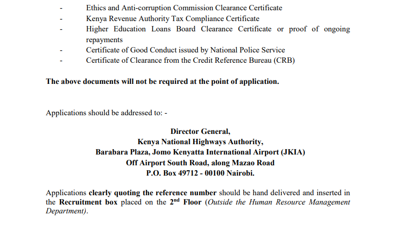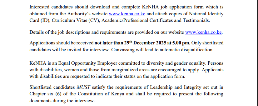Interested candidates should download and complete KeNHA job application form which is obtained from the website www.kenha.co.ke and attach copies of National Identity Card (ID), Curriculum Vitae (CV), Academic/Professional Certificates and Testimonials.