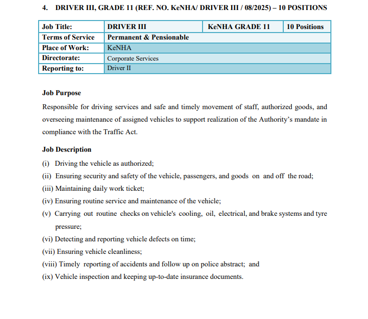 Interested candidates should download and complete KeNHA job application form which is obtained from the website www.kenha.co.ke and attach copies of National Identity Card (ID), Curriculum Vitae (CV), Academic/Professional Certificates and Testimonials.
