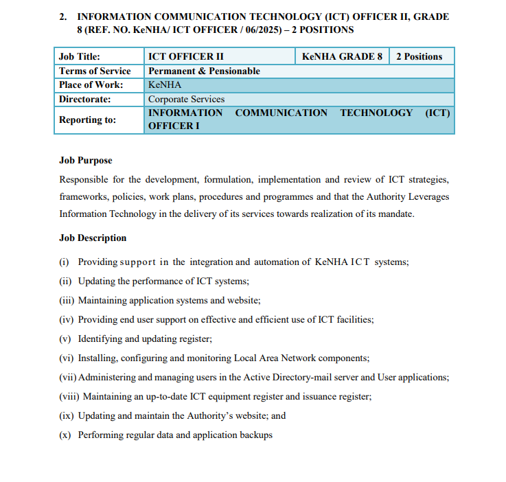 Interested candidates should download and complete KeNHA job application form which is obtained from the website www.kenha.co.ke and attach copies of National Identity Card (ID), Curriculum Vitae (CV), Academic/Professional Certificates and Testimonials.