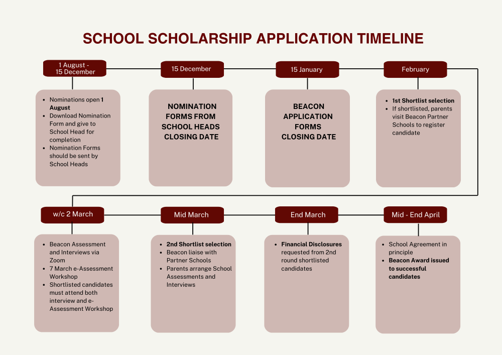 Generally, there will be a maximum of one new Beacon Scholarship available each year at a Beacon Partner School. Beacon Scholars will continue to be supported for each subsequent year of their secondary education up to their final year, subject to performance.