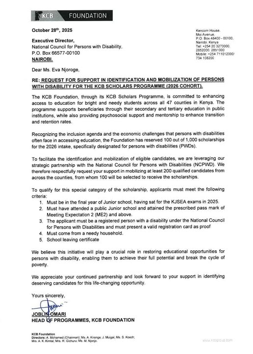 The KCB Foundation, in partnership with the National Council for Persons with Disabilities (NCPWD), is reaching out to support learners with disabilities who will be joining Senior Secondary School in 2026.