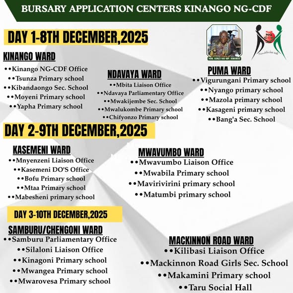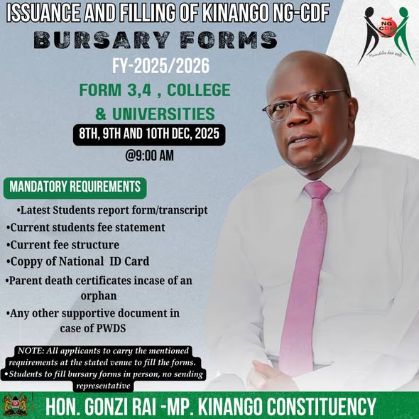 In line with our continued commitment to support education and reduce the financial burden on parents, the Kinango NG-CDF announces the issuance of bursary application forms for the 2025/2026 academic year.