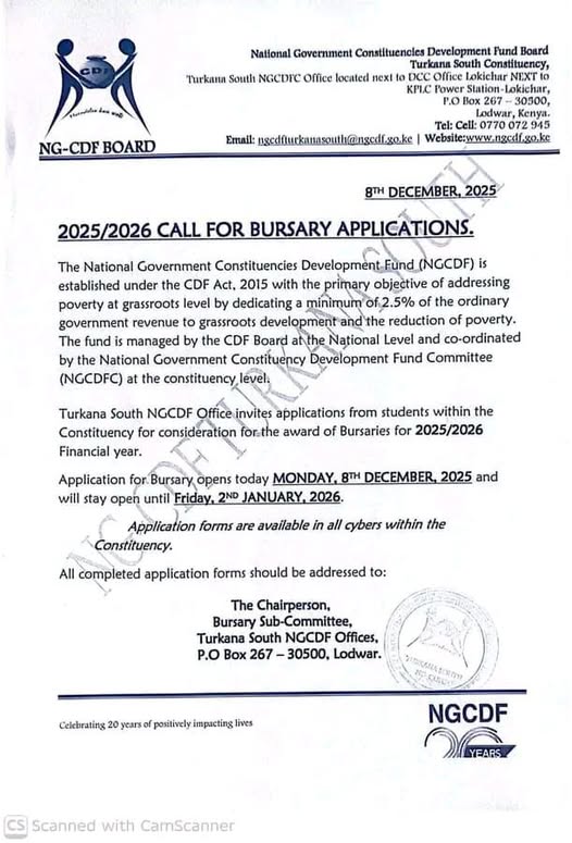 The office of CDF Turkana south is calling students to apply the annually cdf bursary starting today 8 Monday to 2 January 2026 .