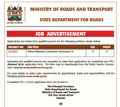 13 Vacancies Open At Ministry Of Roads And Transport State Department Of Roads