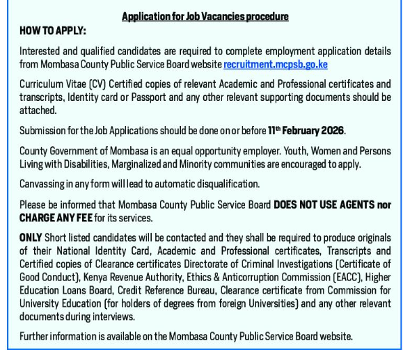 Interested and qualified candidates are required to submit their applications through the official Mombasa County Public Service Board recruitment portal.