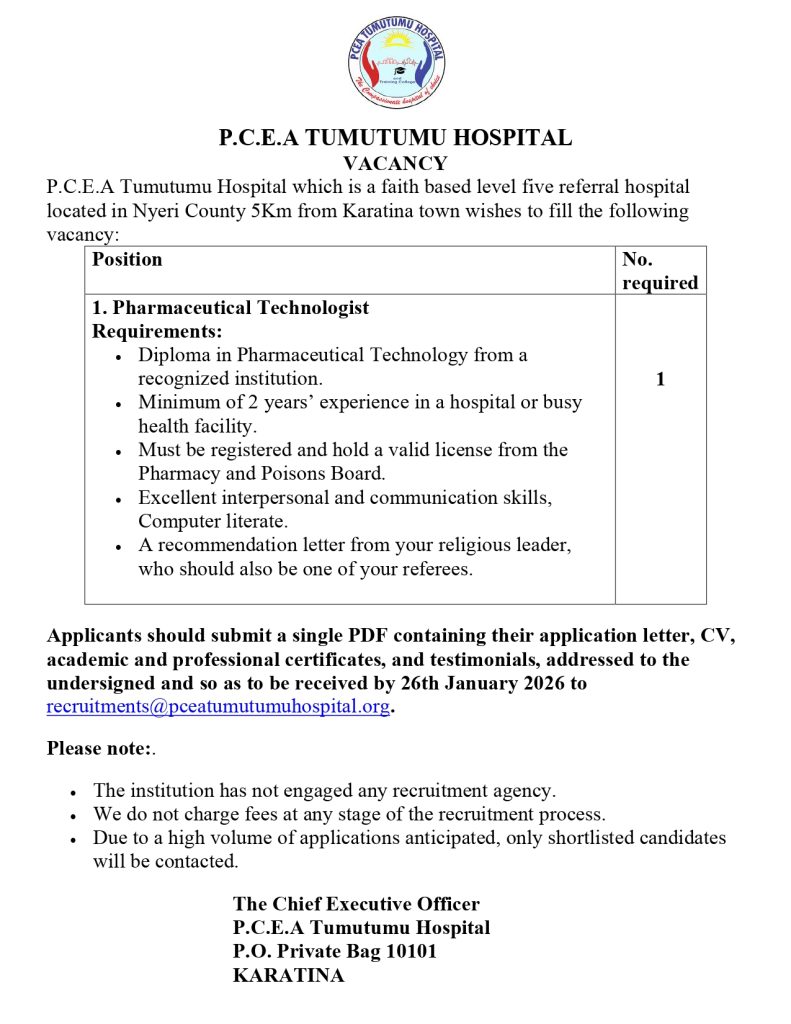 P. C. E. A Tumutumu Hospital Which Is a Faith Based Level Fice Referral Hospital Located In Nyeri County 5km From Karatina Town Wishes To fill the following Vacancy