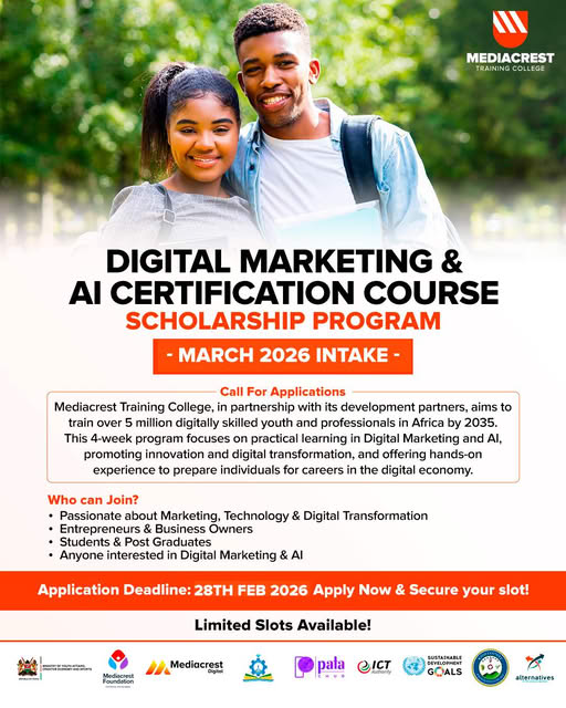 ScholarshipsKenyan Scholarships Call For Scholarship Applications by OYK February 2, 2026 written by OYK February 2, 2026 110 Call For Scholarship Applications! An opportunity to become a better version of yourself in 2026 begins with advancing your digital skills. We’re excited to open applications for the Digital Marketing & AI Scholarship Program, March 2026 Intake. Apply today:️ https://mediacrestcollege.com/digital-marketing-scholarship Application Deadline: 28th February 2026 For more information, Call/WhatsApp: +254 725 223 669 Share FacebookTwitterWhatsappTelegram You may also like MPESA Foundation 2026 Scholarship Applications Open 2026 2JIAJIRI SCHOLARSHIP APPLICATION OPEN KCB Foundation Scholarships Open – April 2026 Intake