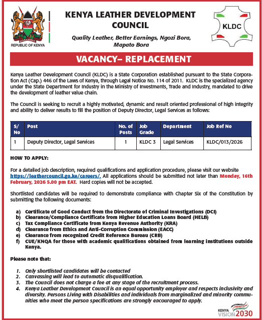 Kenya Leather Development Council (KLDC) is a State Corporation established pursuant to the State Corporation Act (Cap.) 446 of the Laws of Kenya, through Legal Notice No. 114 of 2011. KLDC is the specialized agency