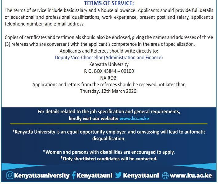 Only shortlisted candidates will be contacted. Kenya University is an equal opportunity employer committed to merit-based recruitment and fair employment practices.