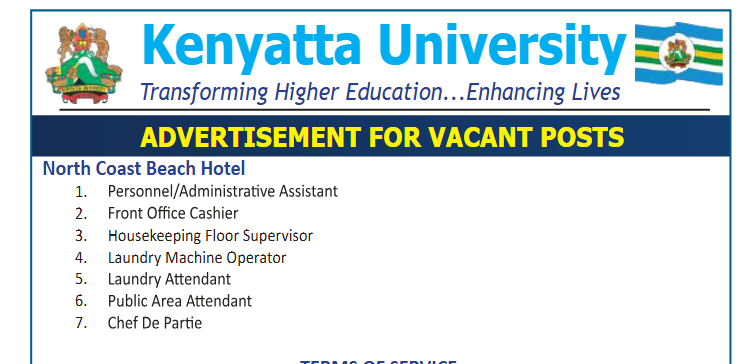 Kenya University is inviting applications from suitably qualified and experienced candidates to fill several administrative and hospitality support positions within its operations. The University remains committed to operational excellence, service delivery efficiency, and the provision of a conducive learning and working environment for students, staff, and visitors.
