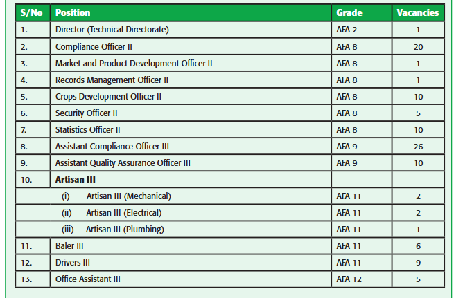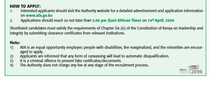 In line with the Authority’s mandate as stipulated in the AFA Act No. 13 of 2013, the Board of Agriculture and Food Authority is seeking to competitively recruit qualified Kenyan professionals to fill the underlisted positions on permanent and pensionable terms: