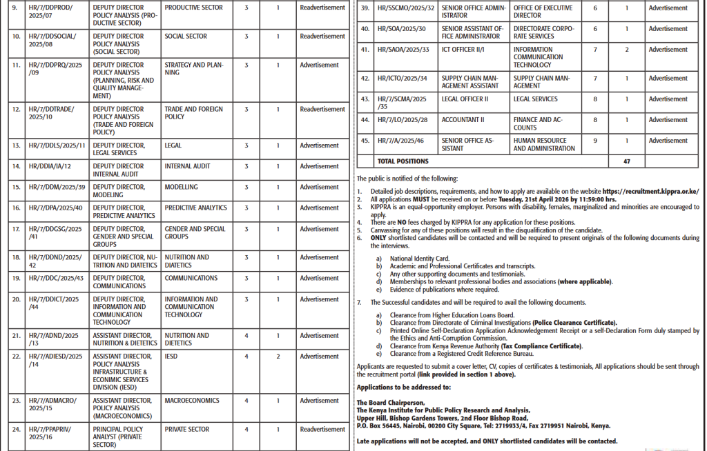 The Kenya Institute for Public Policy Research and Analysis invites applications from qualified candidates for the following Forty-Seven (47) positions.