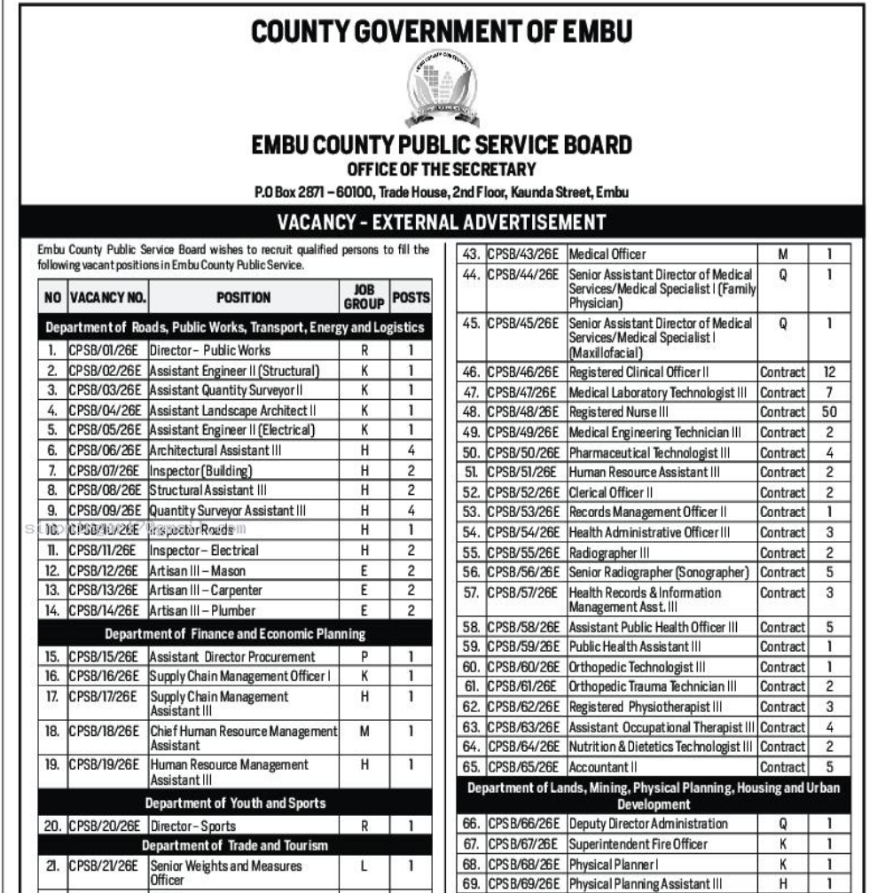 County Government 196 Vacancies Open In County Government Of Embu by Adonai April 1, 2026 written by Adonai April 1, 2026 3 Share FacebookTwitterWhatsappTelegram You may also like 196 Vacancies Open In County Government Of Embu 156 Vacancies Open At County Government of Nakuru 40 Vacancies Open At Makueni County Public Service...