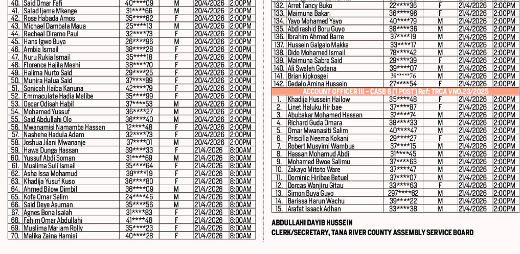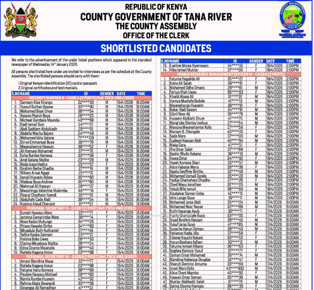 Shortlisted Candidates Shortlisted Candidates At County Government of Tana River by OYK April 9, 2026 written by OYK April 9, 2026 3 Share FacebookTwitterWhatsappTelegram You may also like Shortlisted Candidates At The County Government Of Kakamega... Shortlisted Candidates At The County Government Of Kakamega... Shortlisted Candidates For The Position Of Deputy Vice...