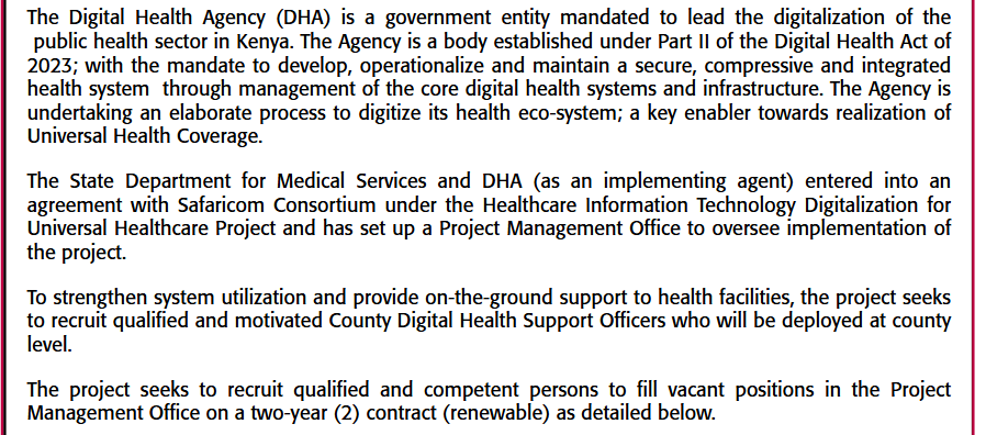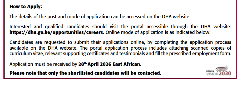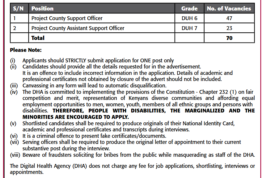 National GovernmentCounty Government DHA Hiring Project County Support Officer And Project County Assistant Support Officer by OYK April 14, 2026 written by OYK April 14, 2026 1 Share FacebookTwitterWhatsappTelegram You may also like 2 Posts Open At KETRACO 39 Vacancies Open At Kenyatta University Teaching, Referral... 16 Vacancies Open At Trans Nzoia County Public...