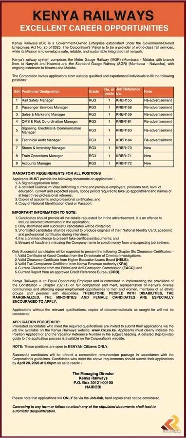Uncategorized 9 Vacancies Open At Kenya Railways by KMax April 20, 2026 written by KMax April 20, 2026 3 Share FacebookTwitterWhatsappTelegram You may also like Internship Program Open At Cytonn 20 Vacancies Open At Releifweb 20 Casuals Vacancies Open At KIMC
