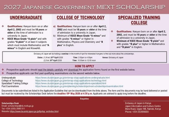 The Embassy of Japan in Kenya has officially opened applications for the 2027 MEXT Scholarship for Kenyan nationals.