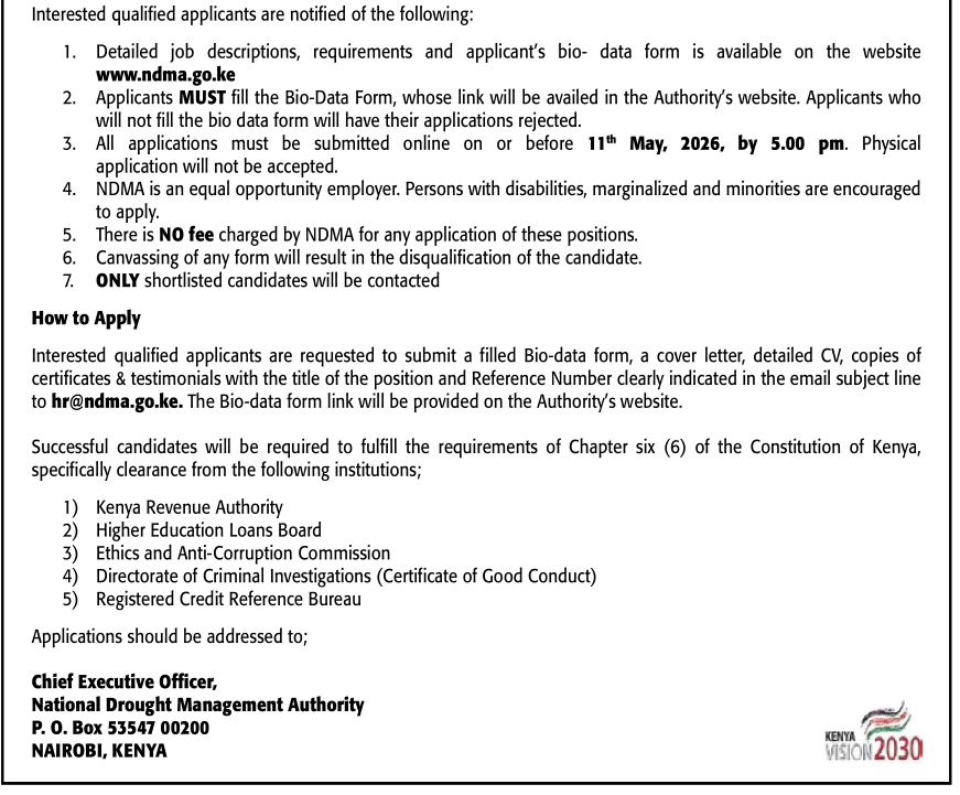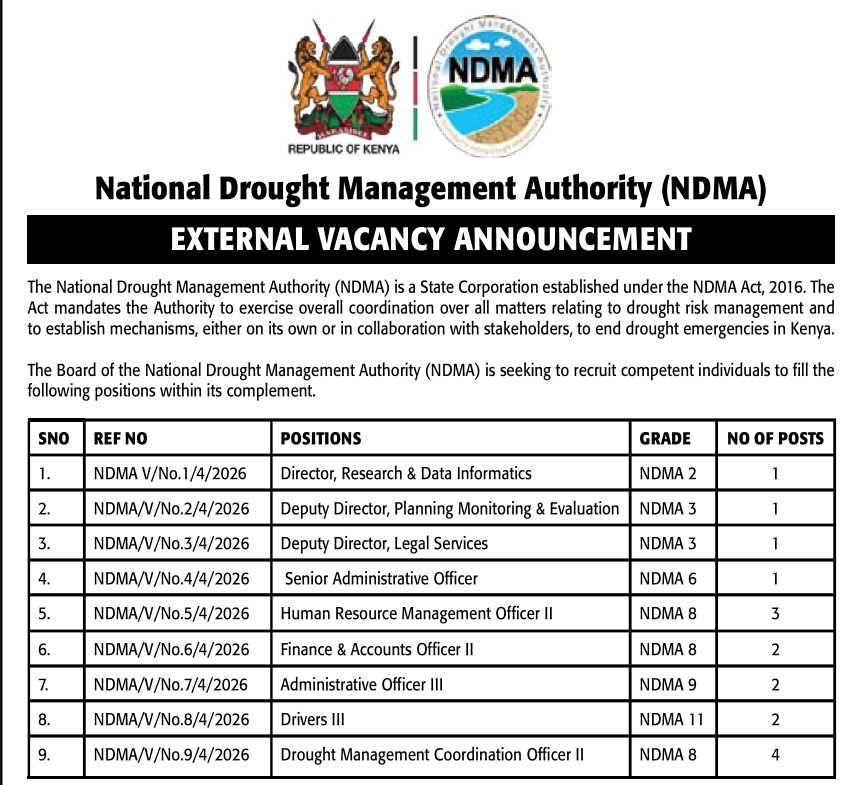 The Board of the National Drought Management Authority (NDMA) is seeking to recruit competent individuals to fill the following positions within its complement