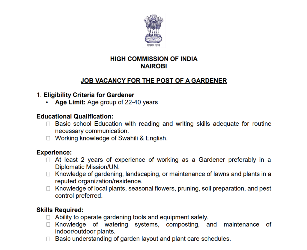 The High Commission of India in Nairobi has announced a job vacancy for the position of Gardener. The role is suitable for candidates with practical gardening experience, basic education, and the ability to communicate in both Swahili and English.
