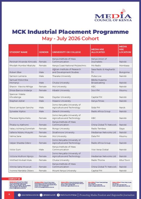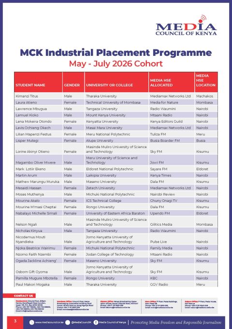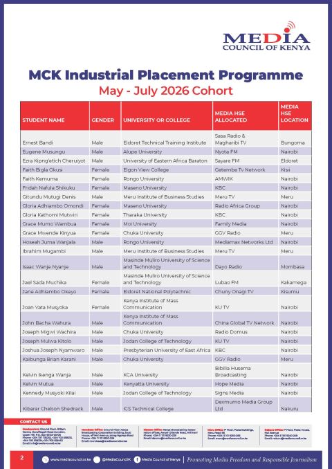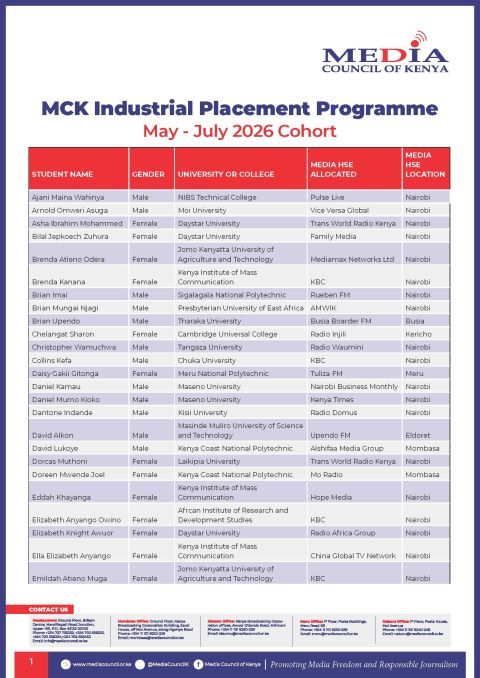 Shortlisted Candidates MCK Industrial Attachment Placement by OYK April 25, 2026 written by OYK April 25, 2026 1 Share FacebookTwitterWhatsappTelegram You may also like Shortlisted Candidates At Office of the Director of... Shortlisted Candidates At Office of the Director of... Shortlisted Candidates Of The National Research Fund