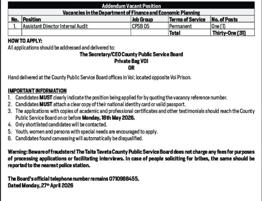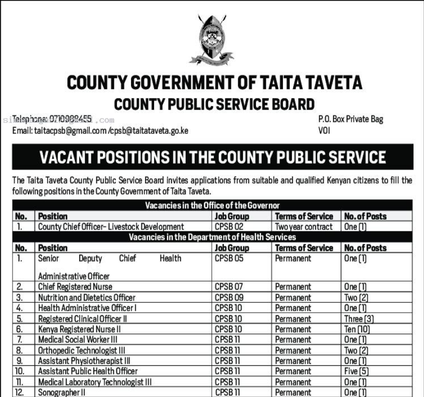 County Government 31 Vacancies Open At County Government of Taita Taveta County by OYK April 27, 2026 written by OYK April 27, 2026 1 Share FacebookTwitterWhatsappTelegram You may also like 92 Vacancies Open At Nakuru County Government 10 Vacancies Open At Machakos County Public Service... 94 Vacancies Open At Machakos County Government