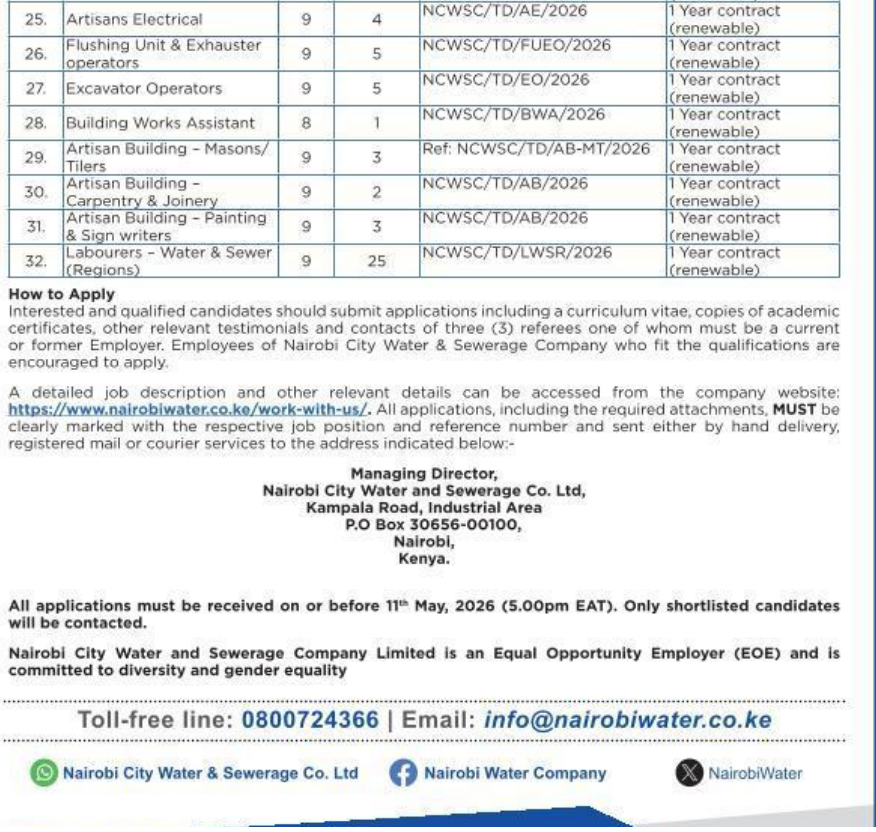 County Government NCWSC Hiring In 32 Sections by OYK April 27, 2026 written by OYK April 27, 2026 1 Share FacebookTwitterWhatsappTelegram You may also like 31 Vacancies Open At County Government of Taita... 92 Vacancies Open At Nakuru County Government 10 Vacancies Open At Machakos County Public Service...